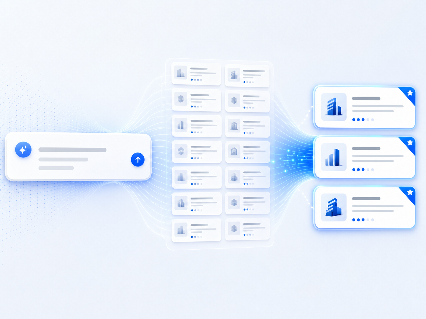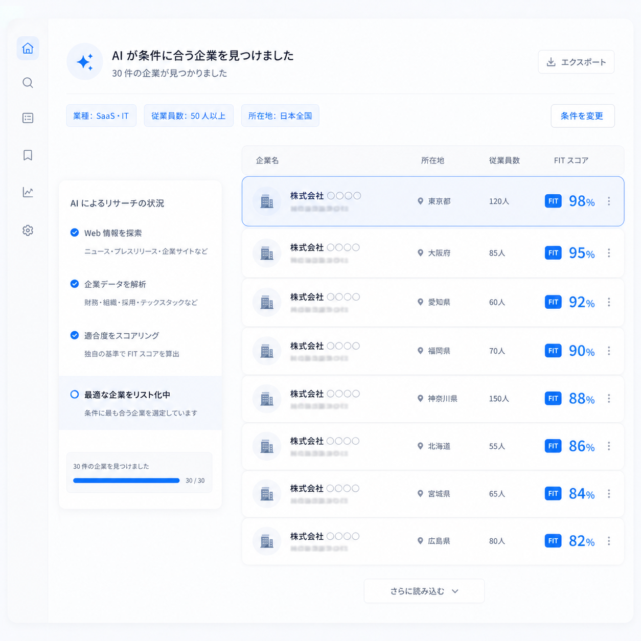 日本語で 1 行書くだけ。AI が公開情報を読み、条件に合う営業先を見つけます